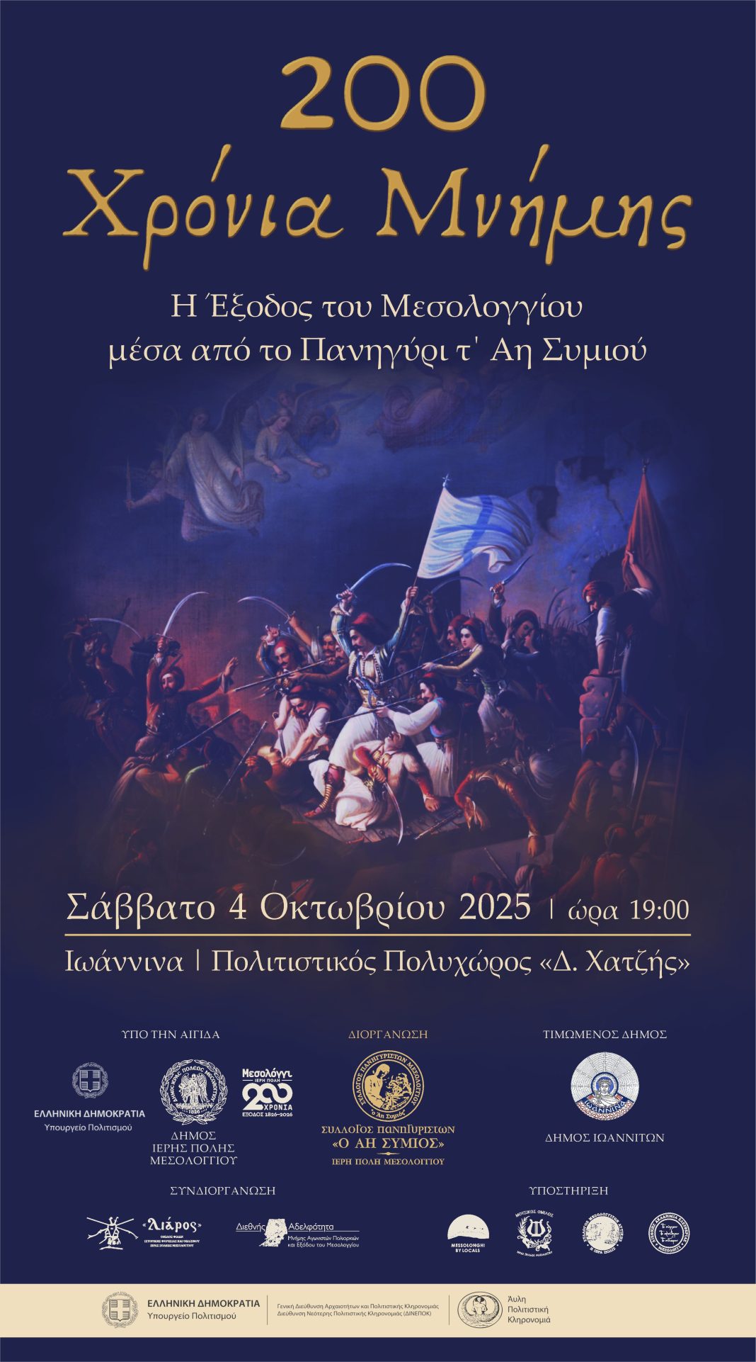 Μία ξεχωριστή δράση με τίτλο: «200 χρόνια μνήμης: Η Έξοδος του Μεσολογγίου μέσα από το πανηγύρι τ’ Άη Συμιού» παρουσιάζει η Διεύθυνση Πολιτιστικών Θεσμών, Εκδηλώσεων και Πολιτισμού του Δήμου Ιωαννιτών, το Σάββατο 4 Οκτωβρίου 2025 και ώρα 19:00, στον Πολιτιστικό Πολυχώρο «Δ. Χατζής».
