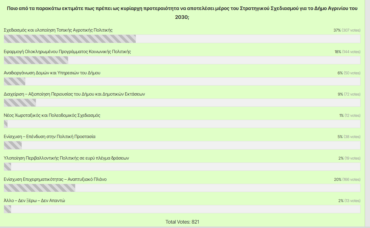 Τα αποτελέσματα της ηλεκτρονικής δημοσκόπησης για τις προτεραιότητες του Στρατηγικού Σχεδιασμού για το Αγρίνιου του 2030 – Νέο ερωτηματολόγιο στο Κώστας Πιστιόλας – ΚΩΣΤΑΣ ΠΙΣΤΙΟΛΑΣ (kostaspistiolas.gr).