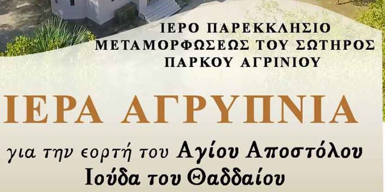Την Τετάρτη 18 Ιουνίου 2025 στο Ιερό Παρεκκλήσιο Μεταμορφώσεως του Σωτήρος Χριστού Πάρκου Aγρινίου, θα τελεσθεί Ιερά Αγρυπνία για την εορτή του Αγίου Απόστολου Ιούδα του Θαδδαίου.