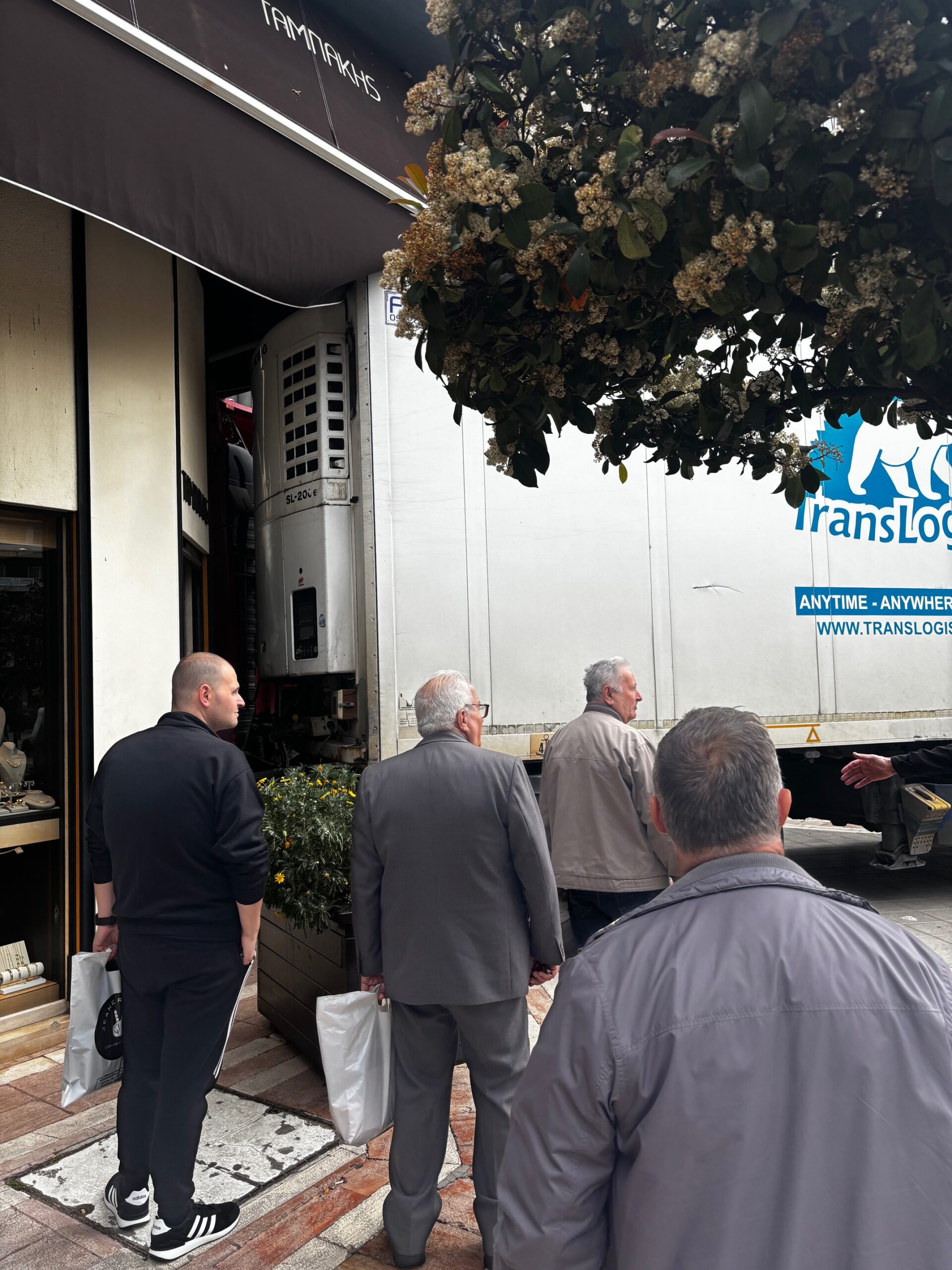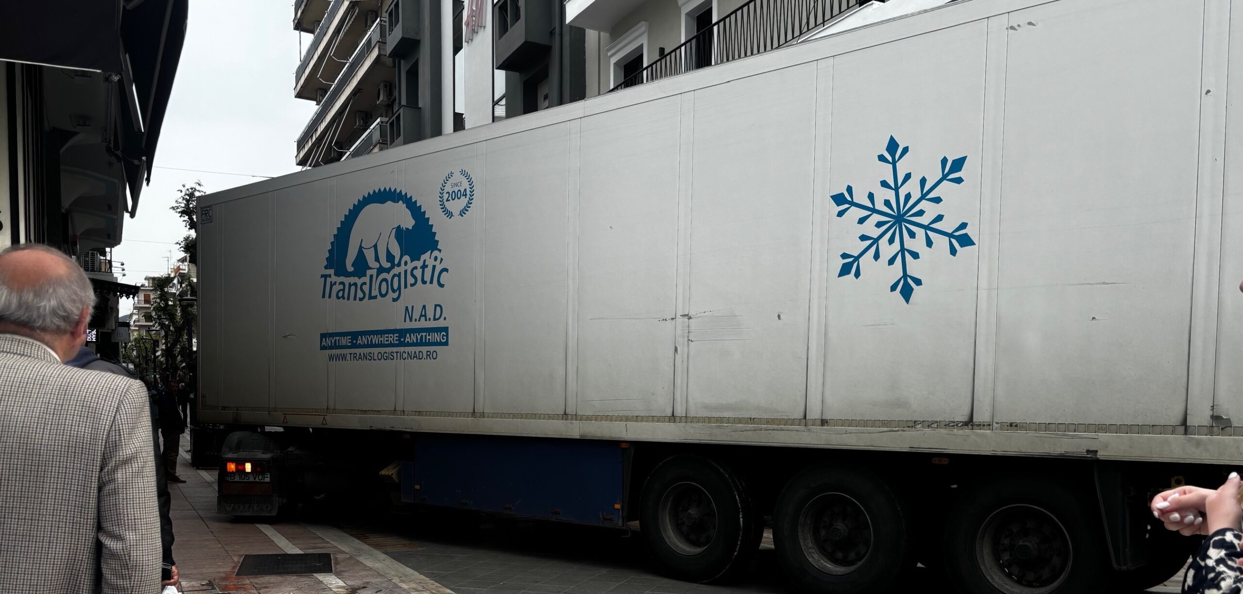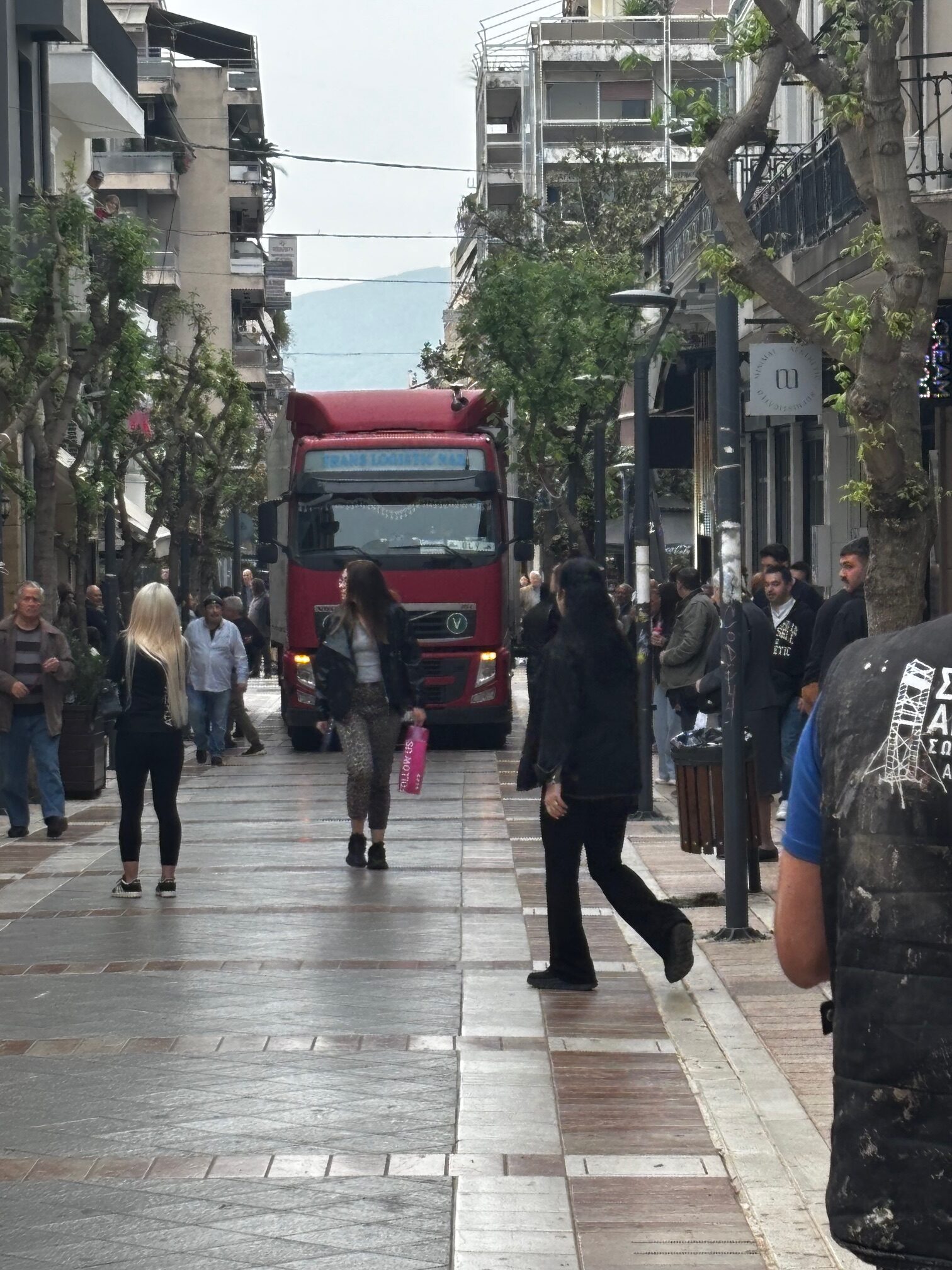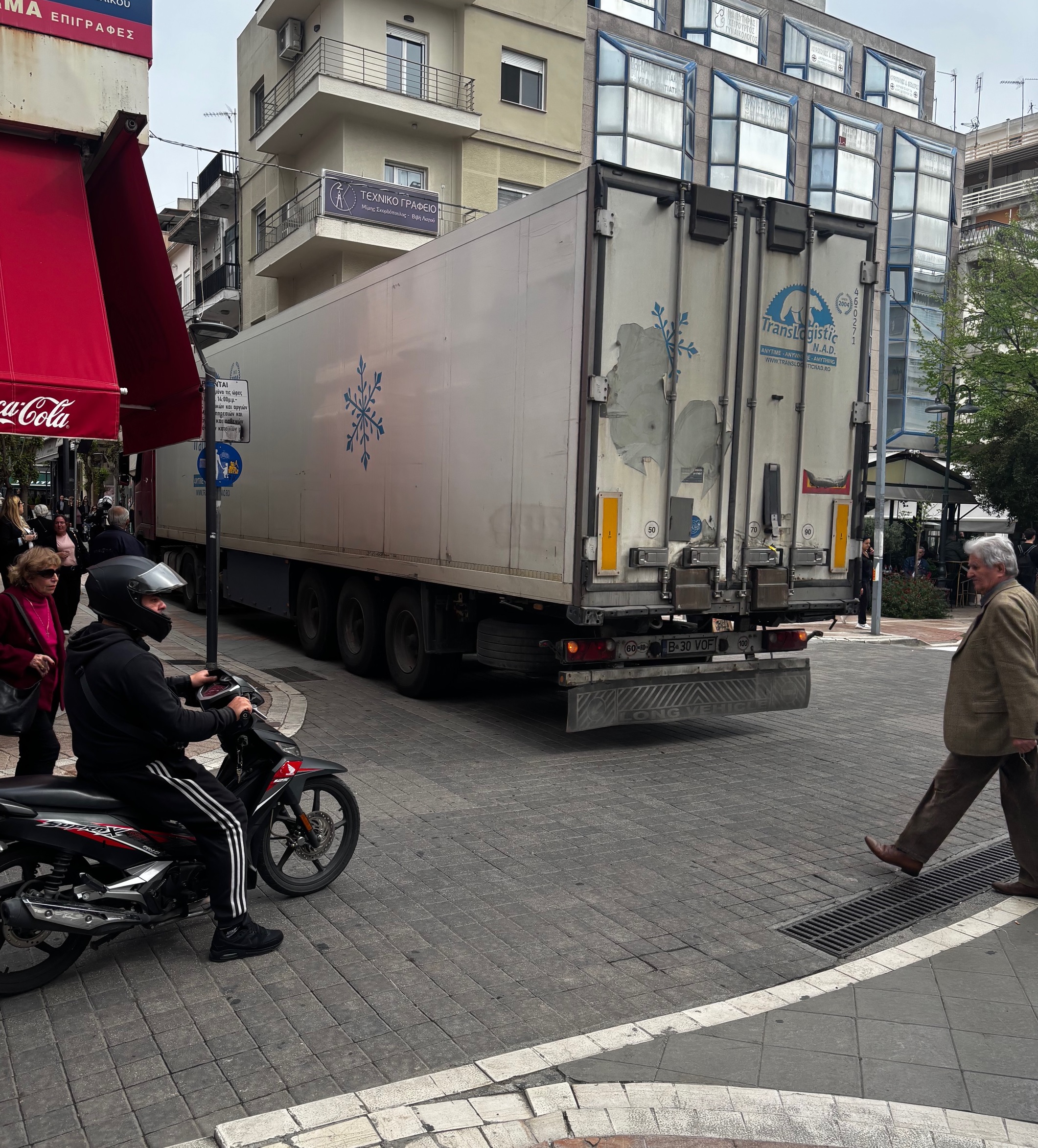 Μετά απο άκρως επαγγελματικές μανούβρες και οριακά ”χαϊδέματα” σε πινακίδες και βιτρίνες καταστημάτων η νταλίκα τελικά ανέβηκε τον πεζόδρομο Παπαστράτου βρίσκοντας δρόμο για την έξοδο απο το κέντρο της πόλης .Την ίδια στιγμή οι πολίτες παρακολούθησαν με απορία την νταλίκα να διέρχεται την οδό Παπαστράτου .
