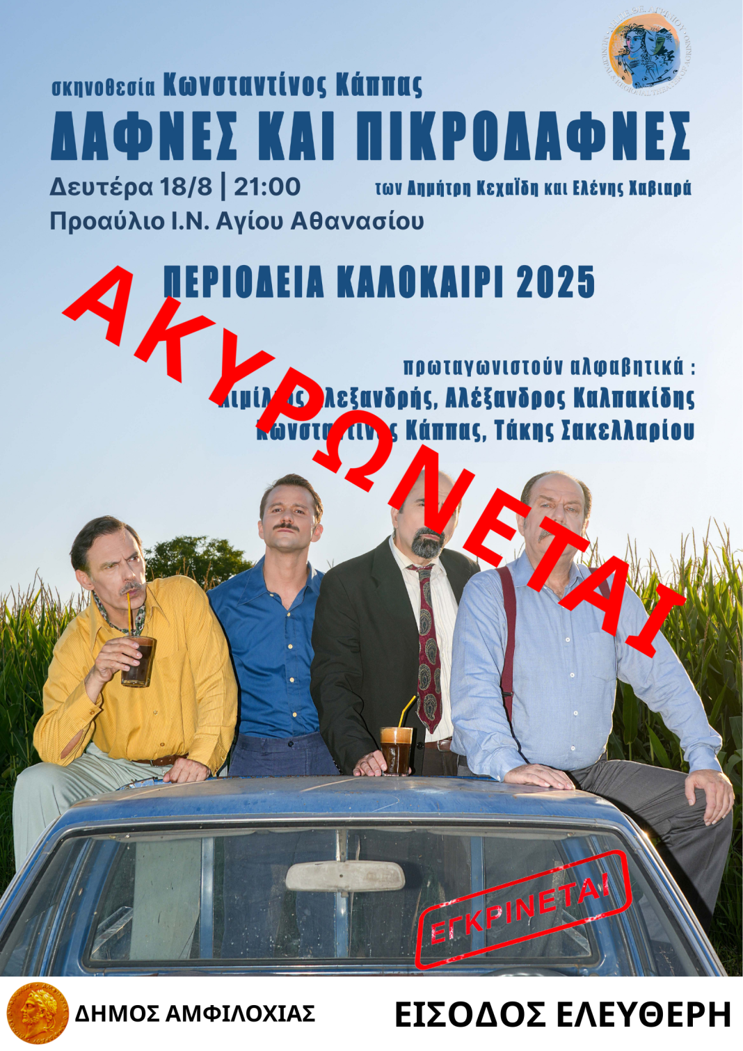 Ο Δήμος Αμφιλοχίας ενημερώνει ότι ακυρώνεται η παράσταση του Δη.Πε.Θε. Αγρινίου, «ΔΑΦΝΕΣ ΚΑΙ ΠΙΚΡΟΔΑΦΝΕΣ» των Δημήτρη Κεχαΐδη και Ελένης Χαβιαρά και σε σκηνοθεσία Κώστα Κάππα, που ήταν προγραμματισμένη για σήμερα, Δευτέρα 18 Αυγούστου στον προαύλιο χώρο του Ι.Ν. Αγίου Αθανασίου στην Αμφιλοχία, λόγω ασθένειας των ηθοποιών.