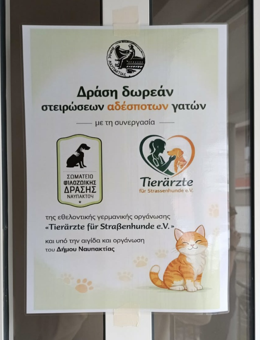 Με ιδιαίτερη επιτυχία συνεχίζεται η εθελοντική δράση δωρεάν στειρώσεων αδέσποτων γατών στον Δήμο Ναυπακτίας, η οποία υλοποιείται στο πλαίσιο της συστηματικής προσπάθειας για τον έλεγχο του πληθυσμού των αδέσποτων ζώων και τη βελτίωση των συνθηκών ευζωίας τους.