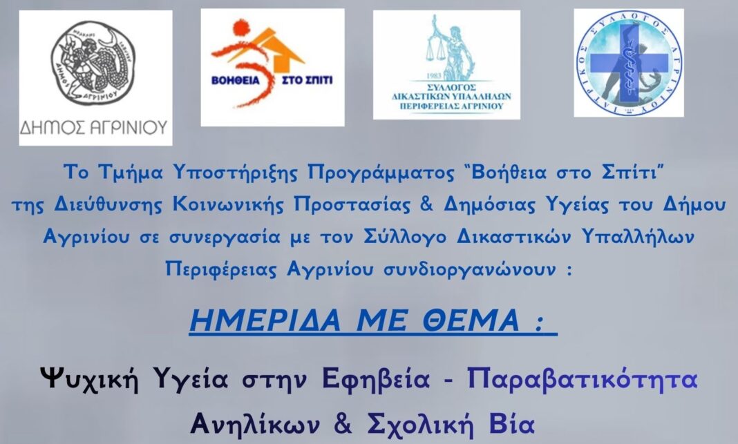 Το Τμήμα Υποστήριξης του Προγράμματος «Βοήθεια στο Σπίτι» της Διεύθυνσης Κοινωνικής Προστασίας και Δημόσιας Υγείας του Δήμου Αγρινίου, σε συνεργασία με τον Σύλλογο Δικαστικών Υπαλλήλων Περιφέρειας Αγρινίου, συνδιοργανώνουν ημερίδα με τίτλο: «Ψυχική Υγεία στην Εφηβεία – Παραβατικότητα Ανηλίκων και Σχολική Βία», η οποία θα πραγματοποιηθεί την Κυριακή 26 Απριλίου 2026 και ώρα 18:30, στην Αίθουσα Δημοτικού Συμβουλίου του Δήμου Αγρινίου.
