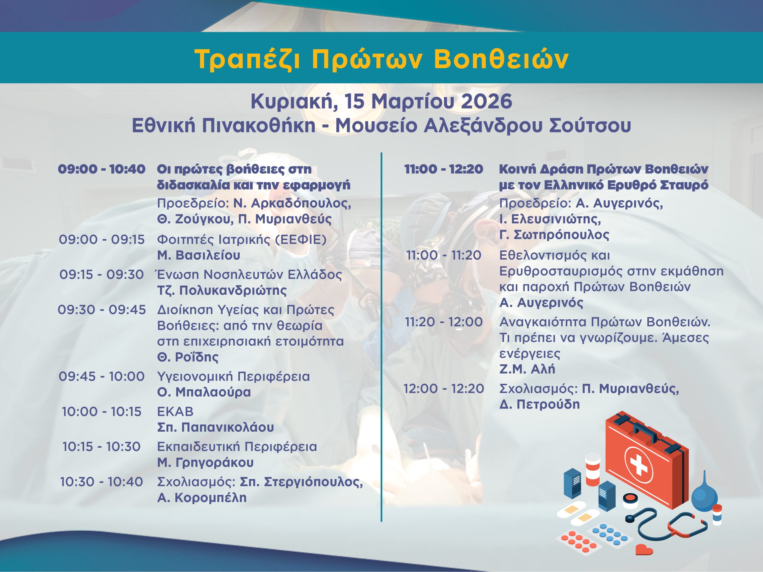 Την Κυριακή 15 Μαρτίου 2026 και ώρες 11:00 – 12:20 θα πραγματοποιηθεί Στρογγυλό Τραπέζι με θέμα τις Πρώτες Βοήθειες, όπου θα συμμετάσχει ο Πρόεδρος του Ελληνικού Ερυθρού Σταυρού, Dr. Αντώνιος Αυγερινός.