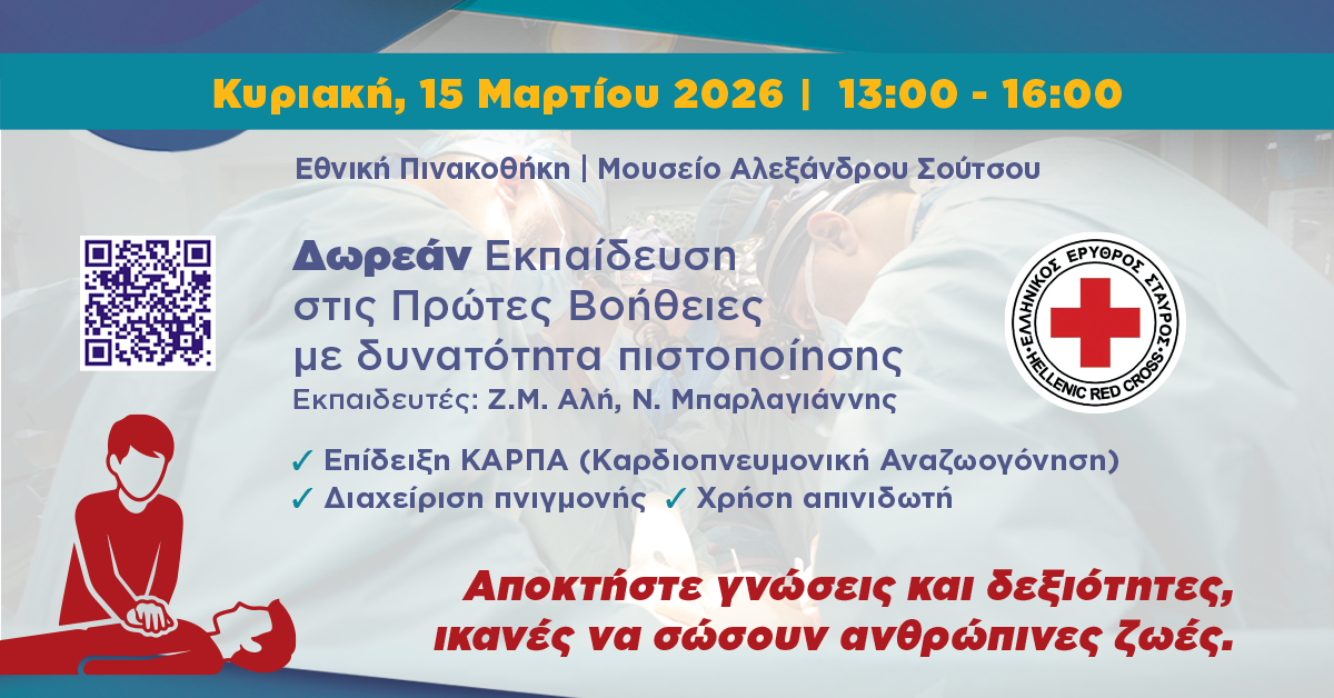Ο Ελληνικός Ερυθρός Σταυρός διοργανώνει δωρεάν εκπαίδευση στις Πρώτες Βοήθειες με δυνατότητα πιστοποίησης, την Κυριακή 15 Μαρτίου 2026, στην Εθνική Πινακοθήκη – Μουσείο Αλέξανδρου Σούτσου