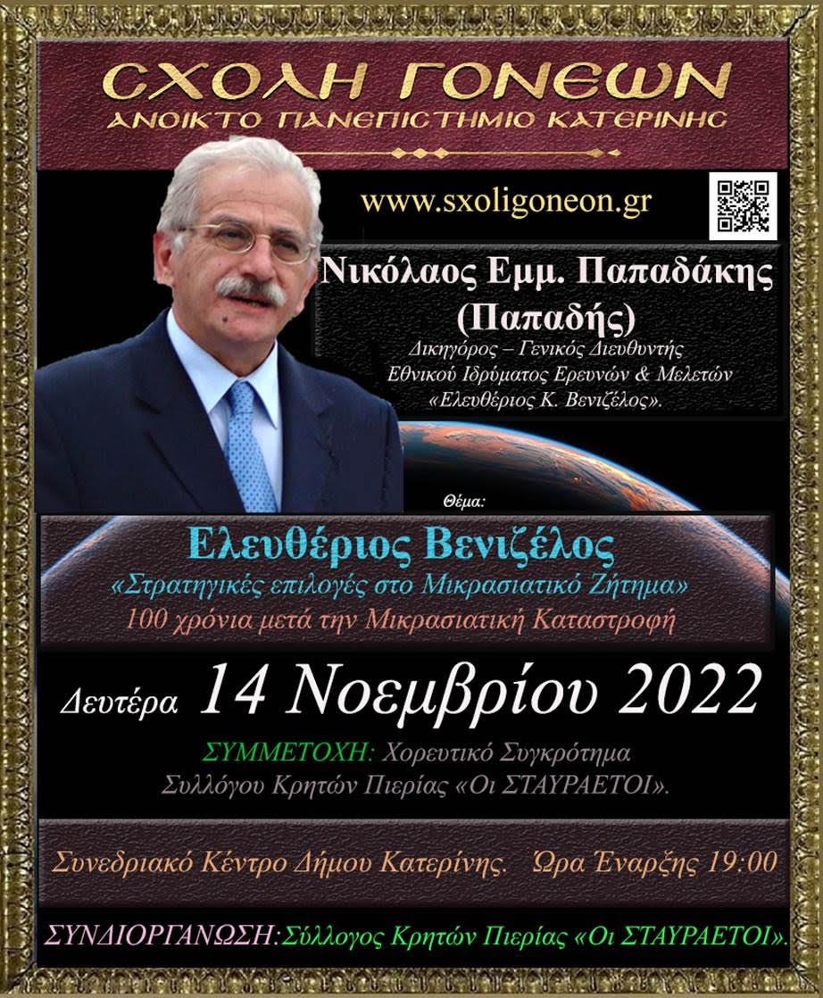Μεγάλη χαρά και εξαιρετική τιμή για την Σχολή Γονέων Ανοικτό Πανεπιστήμιο Κατερίνης η εκδήλωση που θα γίνει την Δευτέρα 14 Νοεμβρίου 2022 με επίσημο ομιλητή και καλεσμένο τον Δικηγόρο – γενικό Διευθυντή του Εθνικού Ιδρύματος Ερευνών & Μελετών «Ελευθέριος Βενιζέλος» κ. Νικόλαο Παπαδάκη (Παπαδή).