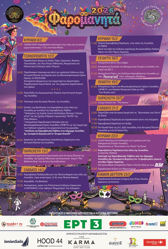 Η καρδιά της Λευκάδας χτυπά δυνατά φέτος τον Φεβρουάριο! Από τις 12 έως τις 23 Φεβρουαρίου, η πόλη γεμίζει χρώματα, μουσική, χορό και αποκριάτικη μαγεία. Παρελάσεις, πάρτυ, παραδοσιακές εκδηλώσεις και καρναβαλικές εκπλήξεις περιμένουν μικρούς και μεγάλους.