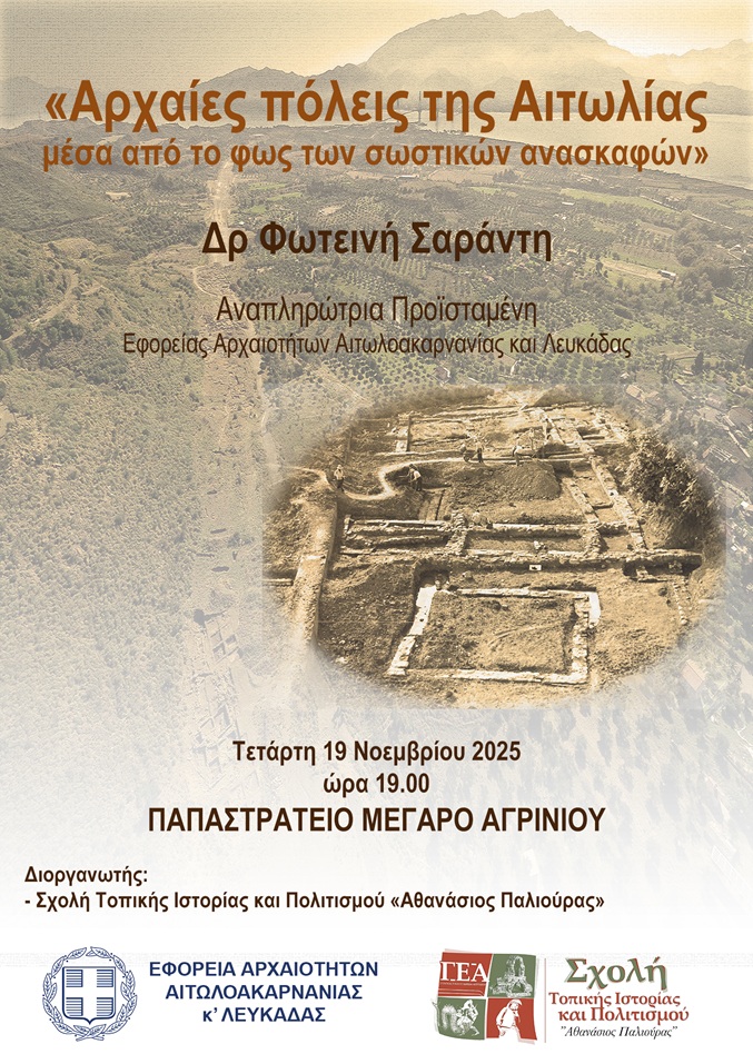 Την Τετάρτη 19 Νοεμβρίου 2025 και ώρα 19:00, στο Παπαστράτειο Μέγαρο υποδεχόμαστε την Δρ Σαράντη Φωτεινή (Αναπληρώτρια Προϊσταμένη Εφορίας Αρχαιοτήτων Αιτωλοακαρνανίας και Λευκάδας) με θέμα «Αρχαίες Πόλεις της Αιτωλίας, μέσα από το φως των σωστικών ανασκαφών».
