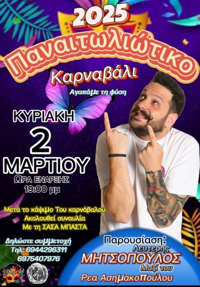 Ο Καρναβαλικός Σύλλογος Παναιτωλίου, καλεί μικρούς και μεγάλους να γίνουμε όλοι μια ομάδα, έτσι ώστε να κυρήξουμε την έναρξη του 3ου Παναιτωλιώτικου καρναβαλιού και την στέψη της νέας βασίλισσας, στις 20 Φεβρουαρίου 2025 και ώρα 19.00 στην Κεντρική Πλατεία του Αγρινίου.