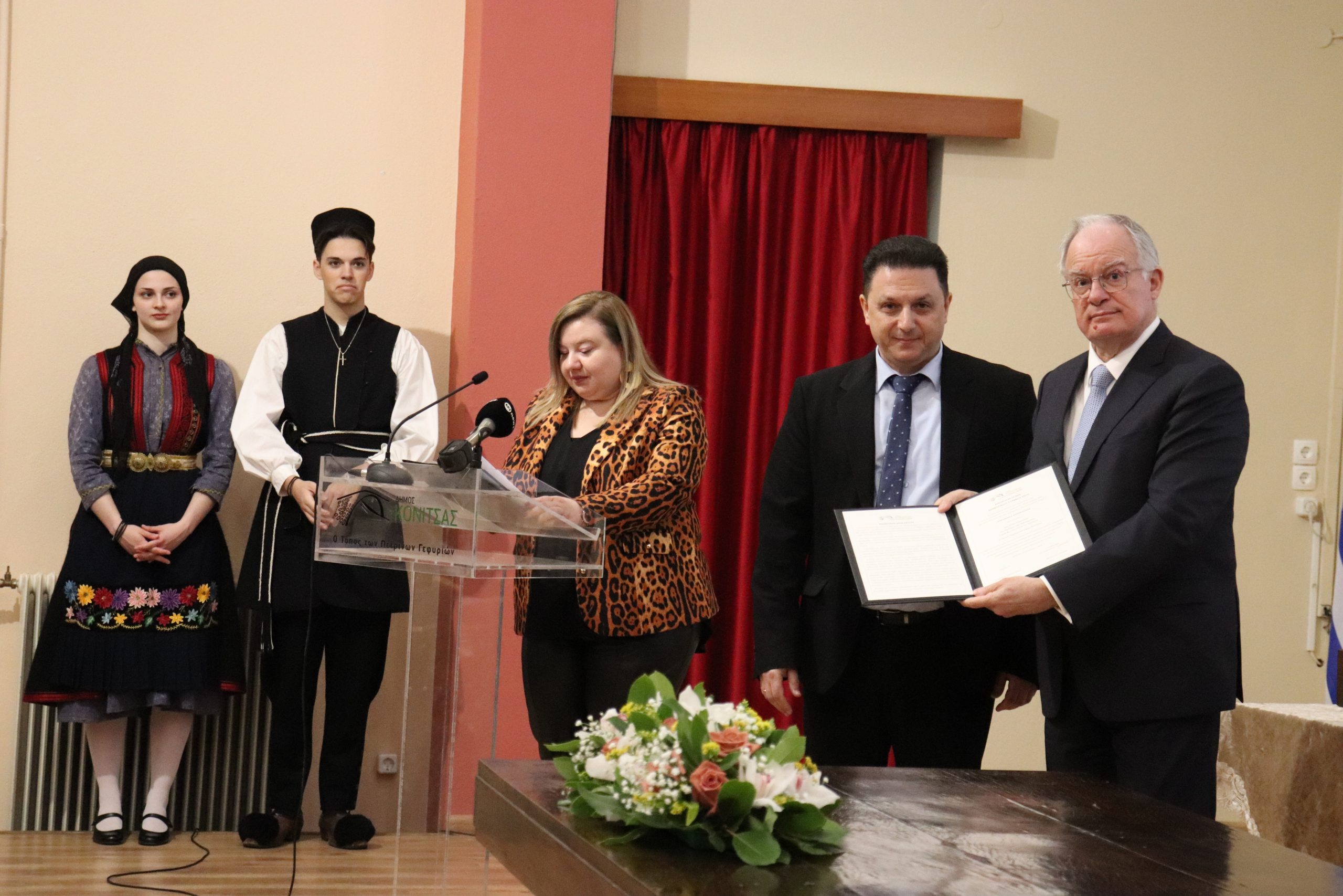 Ακολούθησε εκδήλωση ανακήρυξης της Α.Ε. του Προέδρου της Δημοκρατίας κ. Κωνσταντίνου Τασούλα σε Επίτιμο Δημότη Κόνιτσας, μετά από ομόφωνη απόφαση του Δημοτικού Συμβουλίου. Κατά την επιτιμοποίηση, ο Αντιδήμαρχος Διοικητικών και Οικονομικών Υπηρεσιών κ. Δημήτριος Κοτσιάφτης, αναπληρωτής του Δημάρχου Κόνιτσας, που απουσίαζε για ανυπέρβλητους λόγους υγείας, προσφώνησε τον Πρόεδρο της Δημοκρατίας και υπογράμμισε ότι η απόφαση του Δημοτικού Συμβουλίου αποτελεί έμπρακτη αναγνώριση της πολύχρονης συνδρομής και στήριξης του κ. Κωνσταντίνου Τασούλα σε θέματα που απασχόλησαν την περιοχή. Ο Πρόεδρος του Δημοτικού Συμβουλίου κ. Βασίλειος Σπανός ανέγνωσε την απόφαση του Δ.Σ. και πρόσφερε στον Πρόεδρο της Δημοκρατίας τιμητική πλακέτα με απόσπασμα της απόφασης, ενώ ο Αντιδήμαρχος πρόσφερε ως αναμνηστικό της επίσκεψης και της ανακήρυξης ως επίτιμου Δημότη Κόνιτσας, μια ασημένια γυναικεία πόρπη του 18ου αιώνα, δείγμα υψηλής δεξιοτεχνίας ηπειρωτών αργυροχρυσοχόων.