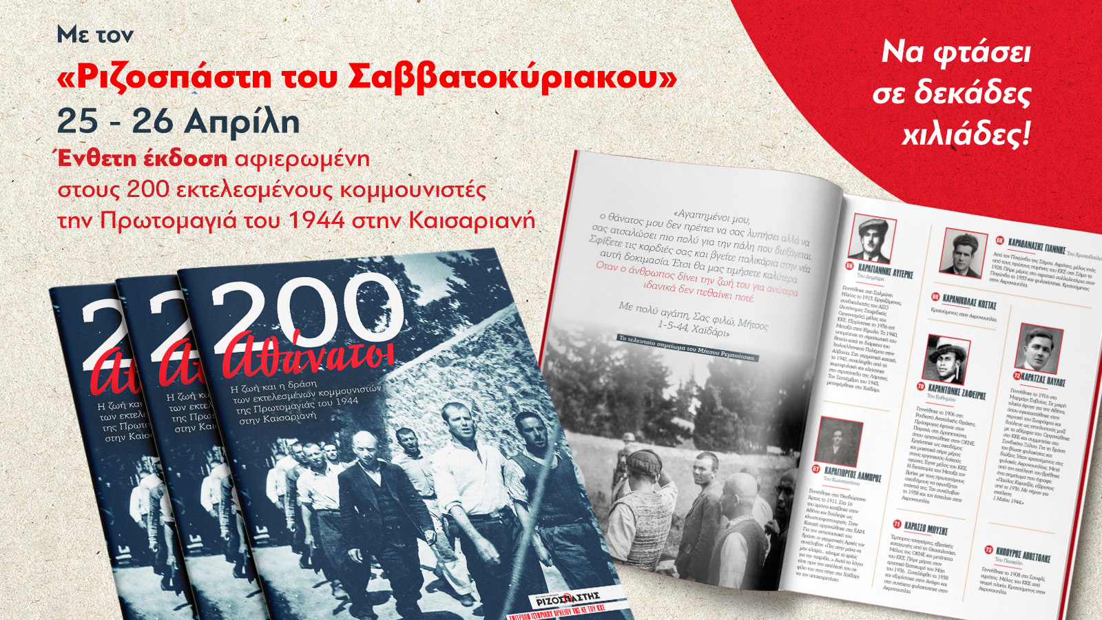 Με μια μοναδική ένθετη έκδοση αφιερωμένη στους 200 εκτελεσμένους κομμουνιστές την Πρωτομαγιά του 1944 στην Καισαριανή θα κυκλοφορήσει ο «Ριζοσπάστης του Σαββατοκύριακου» στις 25-26 Απριλίου. Οι Οργανώσεις του ΚΚΕ και της ΚΝΕ στην Αιτωλοακαρνανία όπως και σε όλη τη χώρα, ετοιμάζουν μεγάλη πανεξόρμηση με το φύλλο του «Ριζοσπάστη», σε πόλεις, γειτονιές, χωριά και χώρους δουλειάς!