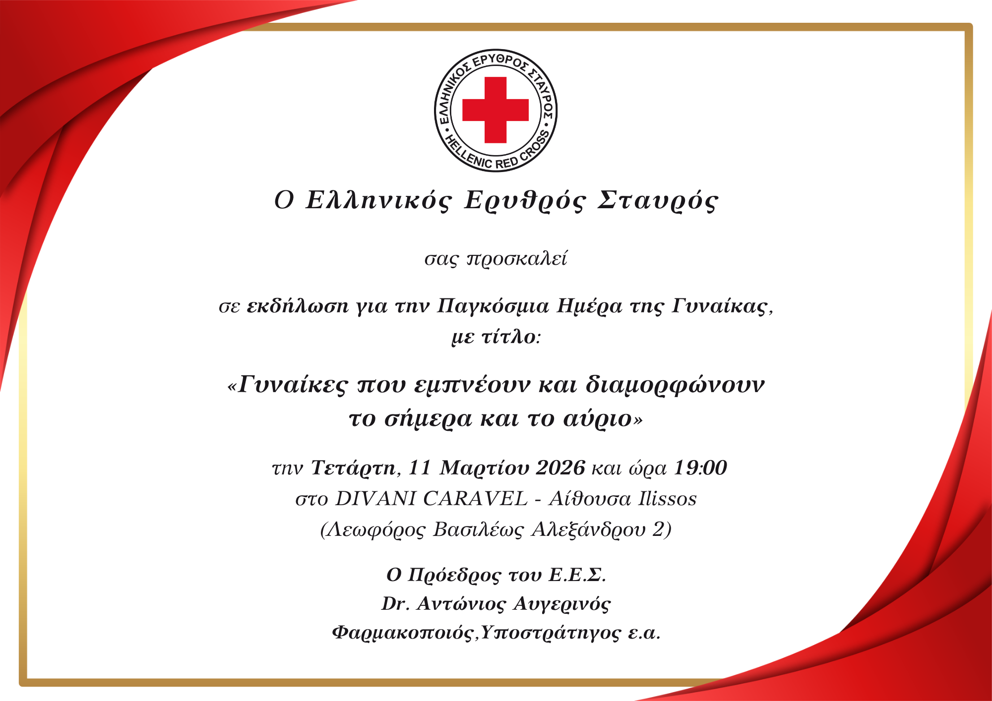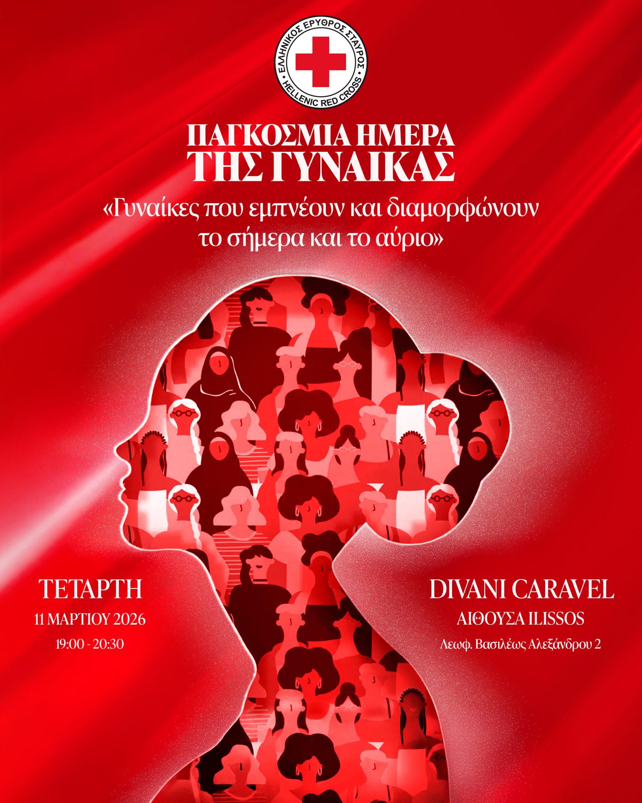 Ο Ελληνικός Ερυθρός Σταυρός (Ε.Ε.Σ.), με αφορμή την Παγκόσμια Ημέρα της Γυναίκας (8/3), διοργανώνει εορταστική εκδήλωση, την Τετάρτη 11 Μαρτίου 2026 και ώρες 19:00 – 20:30, στο ξενοδοχείο Divani Caravel (Αίθουσα Ιλισσός), με τίτλο: “Γυναίκες που εμπνέουν και διαμορφώνουν το σήμερα και το αύριο”, η οποία είναι αφιερωμένη σε γυναίκες που με τη διαδρομή και την προσφορά τους εμπνέουν και διαμορφώνουν θετικά το