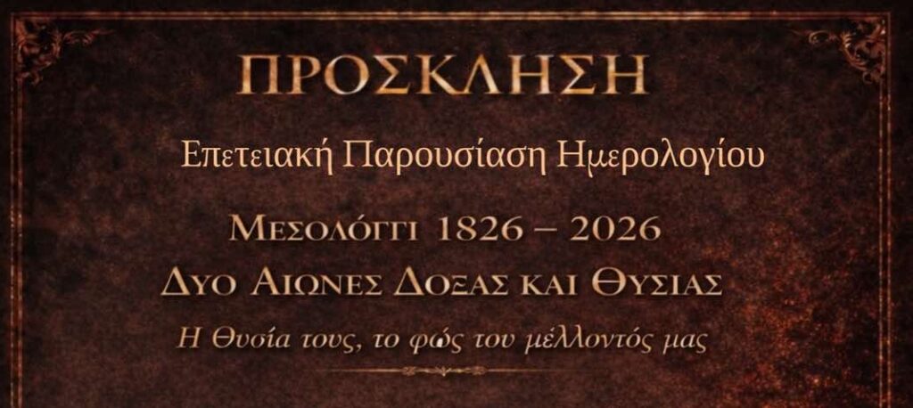 Η Ένωση Αστυνομικών Υπαλλήλων Νοτιοανατολικής Αττικής σε συνεργασία με την Ένωση Αστυνομικών Υπαλλήλων Αιτωλίας ανακοινώνει την επίσημη παρουσίαση του Ημερολογίου για το έτος 2026 με τίτλο «Μεσολόγγι 1826-2026 ΔΥΟ ΑΙΩΝΕΣ ΔΟΞΑΣ ΚΑΙ ΘΥΣΙΑΣ Η Θυσία τους, το φως του μέλλοντος μας», η οποία θα πραγματοποιηθεί τη Δευτέρα 9 Μαρτίου 2026 και ώρα 18:00, στο Τρικούπειο Πολιτιστικό Κέντρο, στην Ιερά Πόλη Μεσολογγίου.