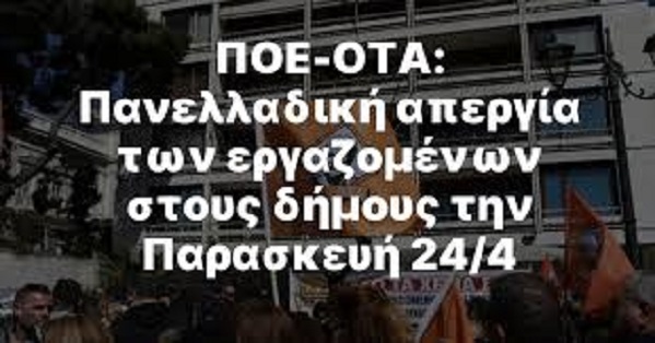Η Πανελλήνια Ομοσπονδία Εργαζομένων Οργανισμών Τοπικής Αυτοδιοίκησης (Π.Ο.Ε.-Ο.Τ.Α.) καλεί όλους τους εργαζόμενους στους Ο.Τ.Α. Α΄ Βαθμού να συμμετάσχουν μαζικά στην 24ωρη Πανελλαδική Απεργία που έχει προκηρυχθεί για την ΠΑΡΑΣΚΕΥΗ 24 ΑΠΡΙΛΙΟΥ 2026 και παράλληλα να δώσουν δυναμικό παρών στην Απεργιακή Συγκέντρωση η οποία θα πραγματοποιηθεί στις 11:00 το πρωί της ίδιας ημέρας έξω από τα γραφεία της Ομοσπονδίας (Καρόλου 24-Πλατεία Καραϊσκάκη-Αθήνα). Αμέσως μετά θα ακολουθήσει Πορεία Διαμαρτυρίας προς το Υπουργείο Εσωτερικών (Βασ. Σοφίας 15) με επιδίωξη τη συνάντηση με την πολιτική ηγεσία.