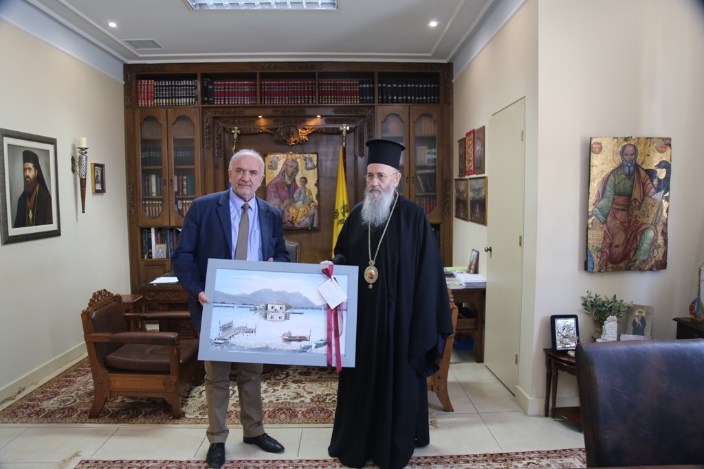 Νωρίτερα είχε ιδιαίτερη συνάντηση με τον Δήμαρχο της Ιεράς Πόλεως Μεσολογγίου, ο οποίος του προσέφερε πίνακα ζωγραφικής με ένα τοπίο από την Λιμνοθάλασσα εις ανάμνηση της εντεκάμηνης Τοποτηρητείας του.