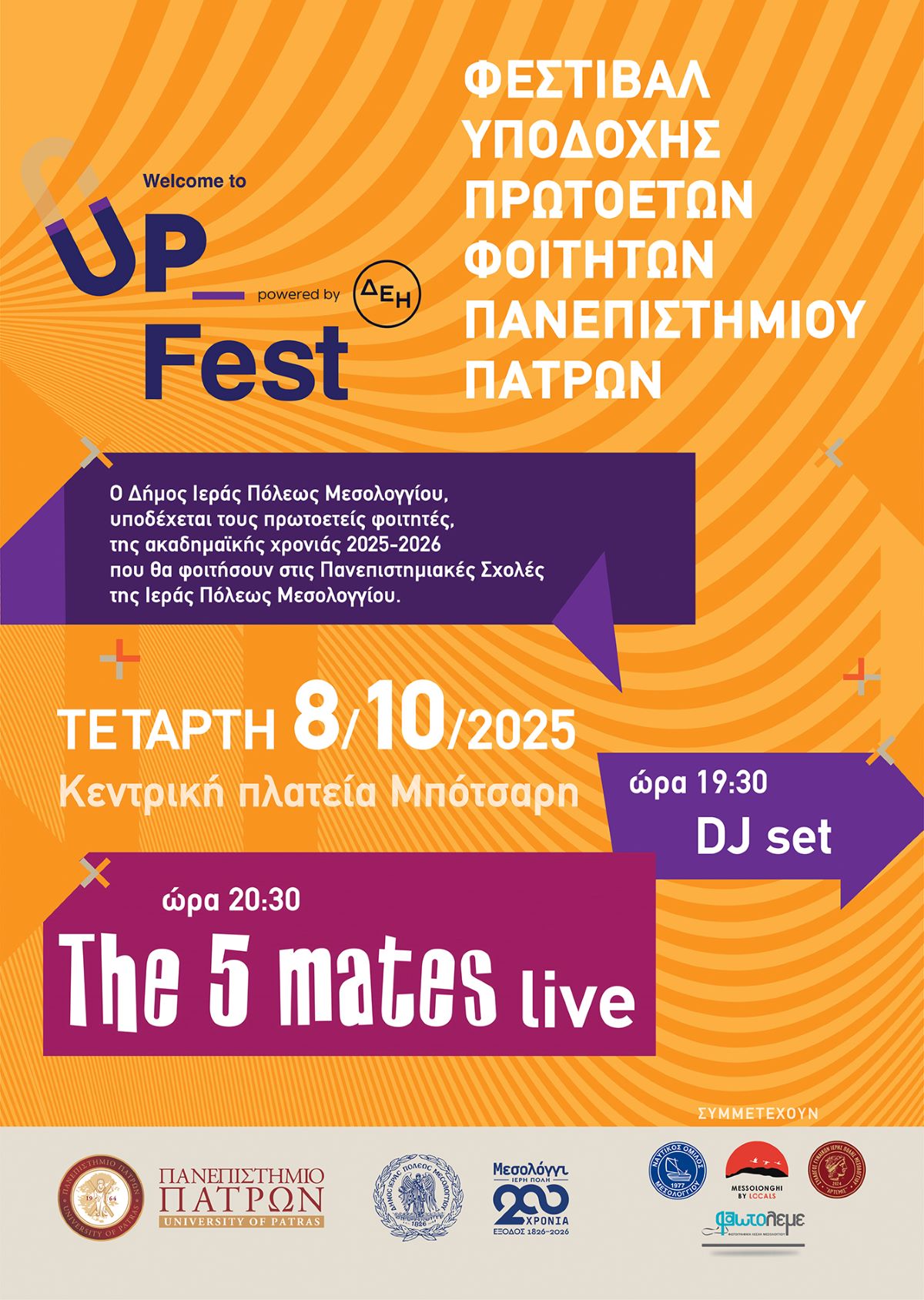 Την Τετάρτη 8 Οκτωβρίου 2025, ο Δήμος Ιερής Πόλης Μεσολογγίου και το Πανεπιστήμιο Πατρών υποδέχονται τους πρωτοετείς φοιτητές με το «Welcome to Up Fest»!