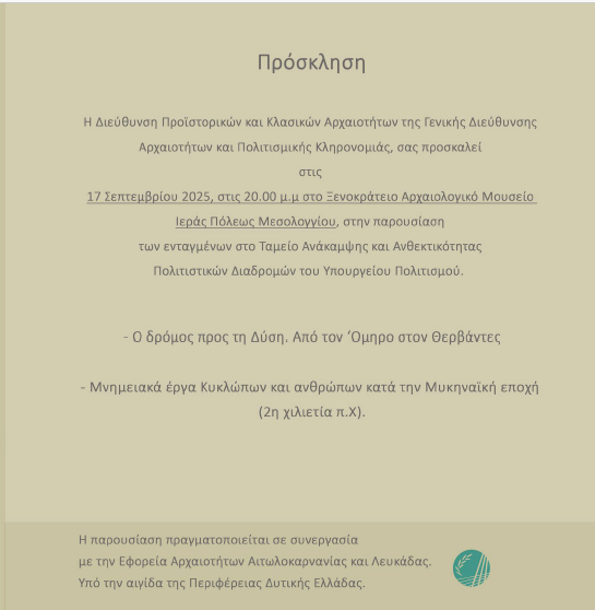 Την Τετάρτη 17 Σεπτεμβρίου και ώρα 8:00 μ.μ. η Διεύθυνση Προϊστορικών και Κλασικών Αρχαιοτήτων της Γενικής Διεύθυνσης Αρχαιοτήτων και Πολιτισμικής Κληρονομιάς, προσκαλεί στο Ξενοκράτειο Αρχαιολογικό Μουσείο Ιεράς Πόλεως Μεσολογγίου, στην παρουσίαση των ενταγμένων στο Ταμείο Ανάκαμψης και Ανθεκτικότητας Πολιτιστικών Διαδρομών του Υπουργείου Πολιτισμού.